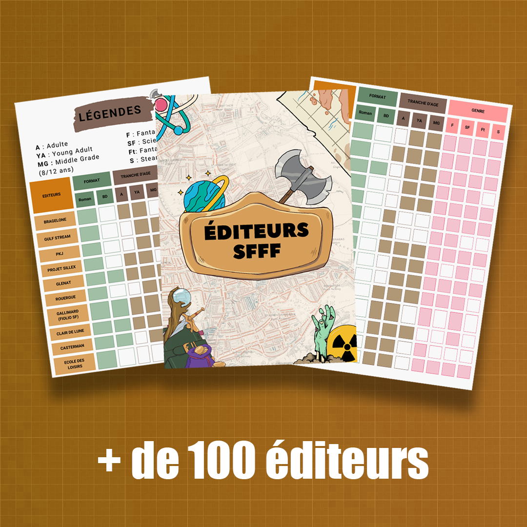 Ma liste d'éditeurs avec à l'intérieur un détails sur : les tranches d'âge, les genre (SF, Fantasy, etc) et le format (BD, roman ou album jeunesse).