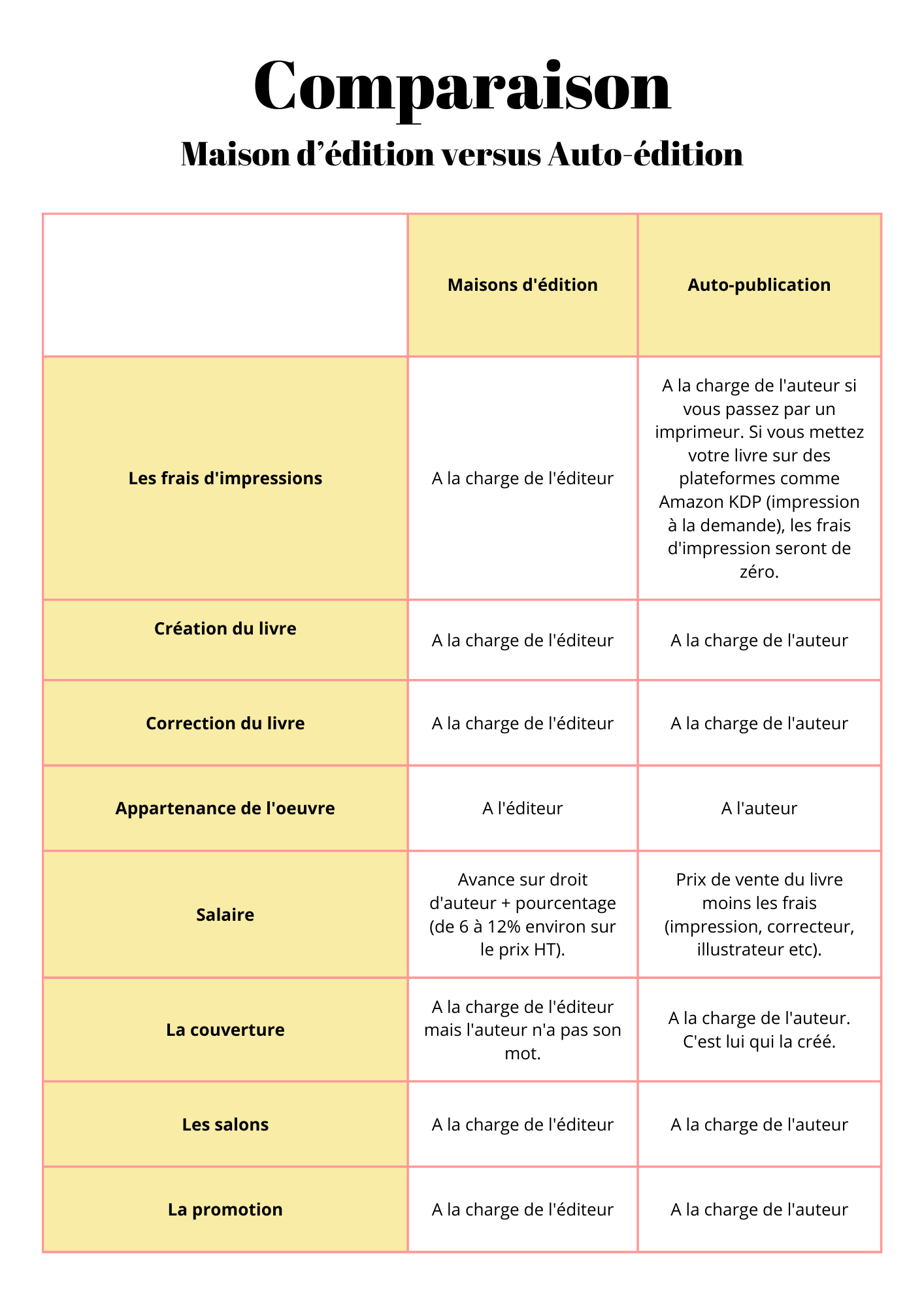 Un tableau comparatif pour mieux comprendre la différence entre maisons d'édition et auto-édition !